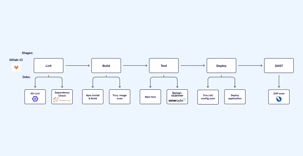XYZ org wants to implement security testing for their software applications; this includes a mix of backend API services and frontend apps, all written in Node.js. Their projects make use of Gitlab SCM, and the company has provided the following requirements: